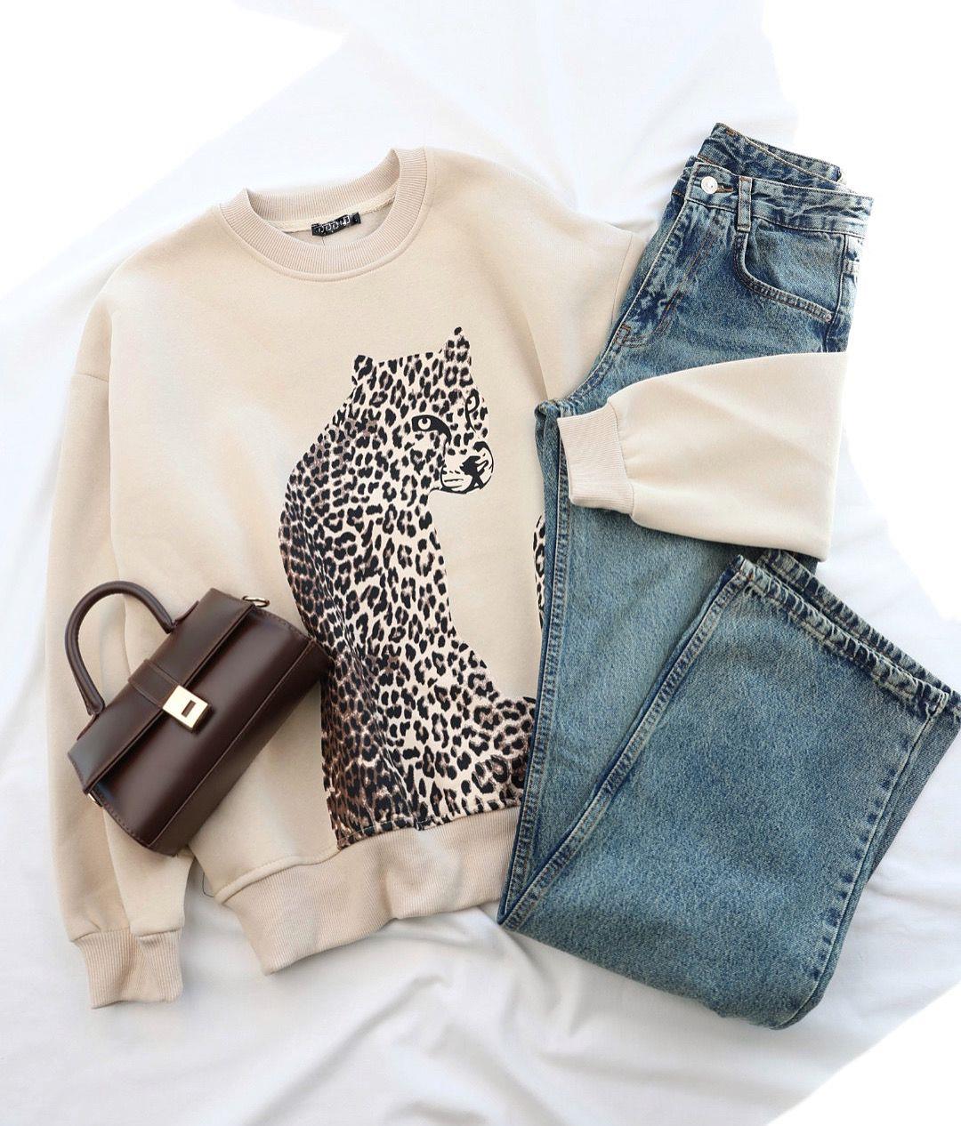Leopar Baskılı Şardonlu 3iplik Sweat