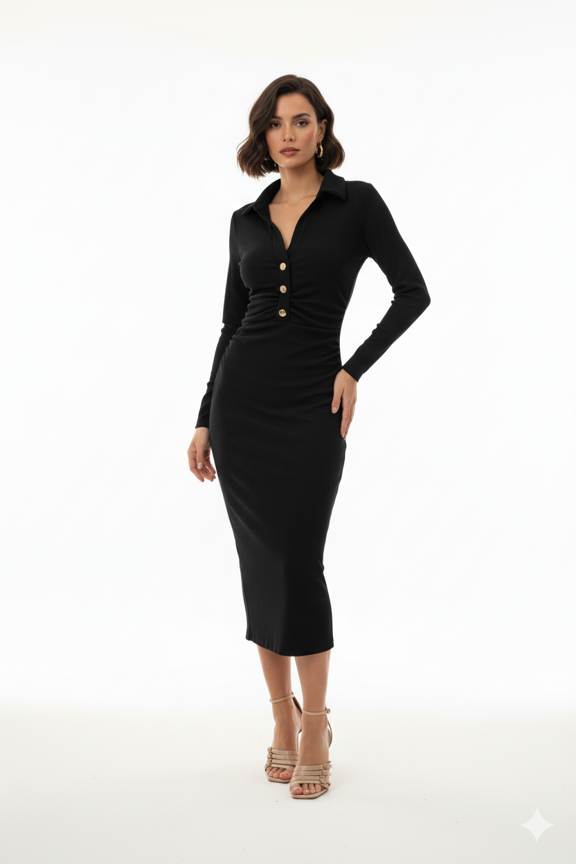 Ürün Bilgisi: Sonbahar/kış sezonunun trendi sonbahar tonundaki bu elbise, fitilli (rib) kumaşı ile vücudu saran modern bir silüet sunar. Ön kısmındaki düğme ve büzgü (drapaj) detayı sayesinde belinizi vurgular. Şık gömlek yakası ve uzun kollarıyla hem sofistike hem de rahat bir görünüm sağlar.