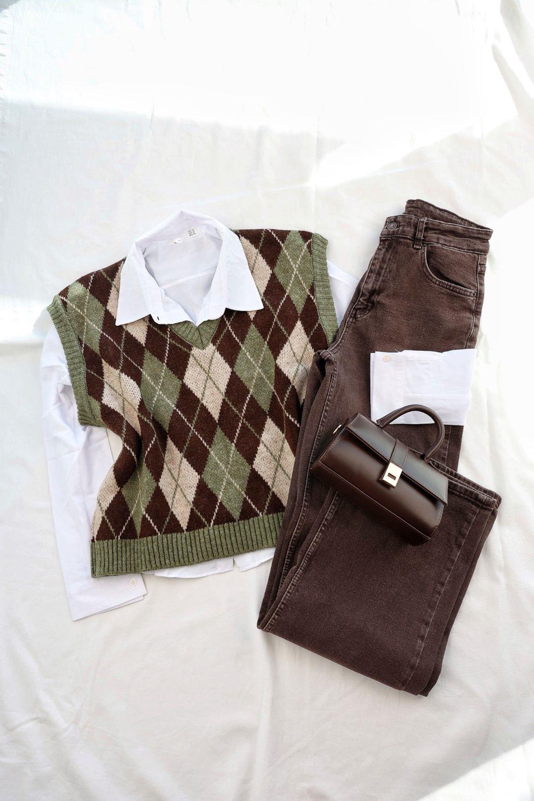 Ürün Bilgisi: Argyle deseniyle klasik ve trend bir görünüm yakalayın. Beyaz basic gömlek üzerine giyilebilen bu V yaka süveter yelek, yüksek bel geniş paça jean pantolonlarla mükemmel uyum sağlıyor. Kırmızı-bordo tonlarındaki çanta detayıyla kombininize sofistike bir dokunuş katın. Günlük, ofis ve sonbahar/kış stili için ideal. Çift kat örme kumaştan üretilmiştir, Soğuk günlerde ideal konfor sağlar.